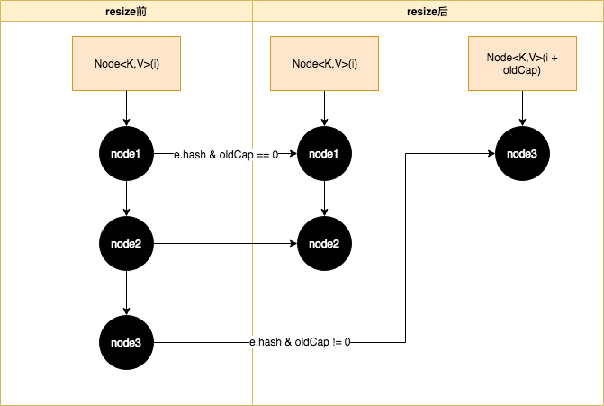 .3.3 当前是链表, JAVA7时还需要重新计算hash位, 但是JAVA8做了优化, 通过(e.hash & oldCap) == 0来判断是否需要移位; 如果为真则在原位不动, 否则则需要移动到当前hash槽位 + oldCap的位置;