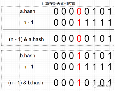 - (e.hash & oldCap) == 0 ,则新表索引位置为“原索引位置” ;