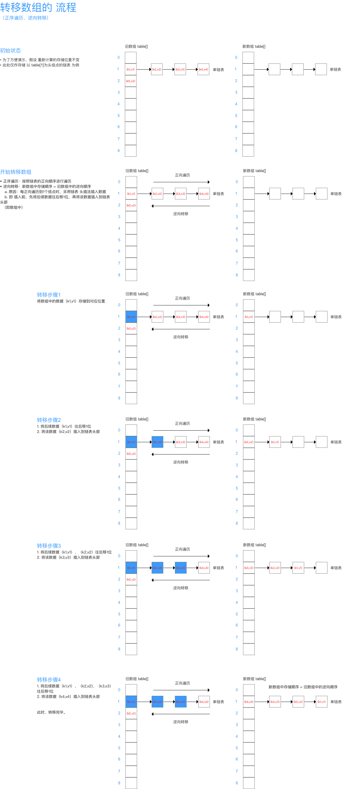 - * 作用:将旧数组上的数据(键值对)转移到新table中,从而完成扩容