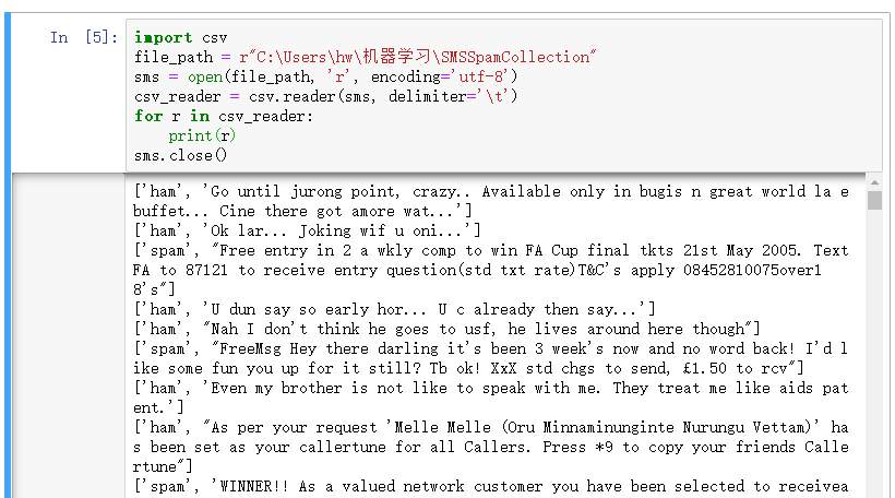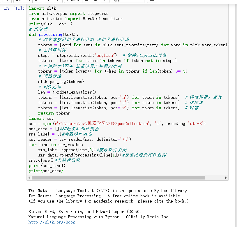 sms_data.append(preprocessing(line[1])) #对每封邮件做预处理