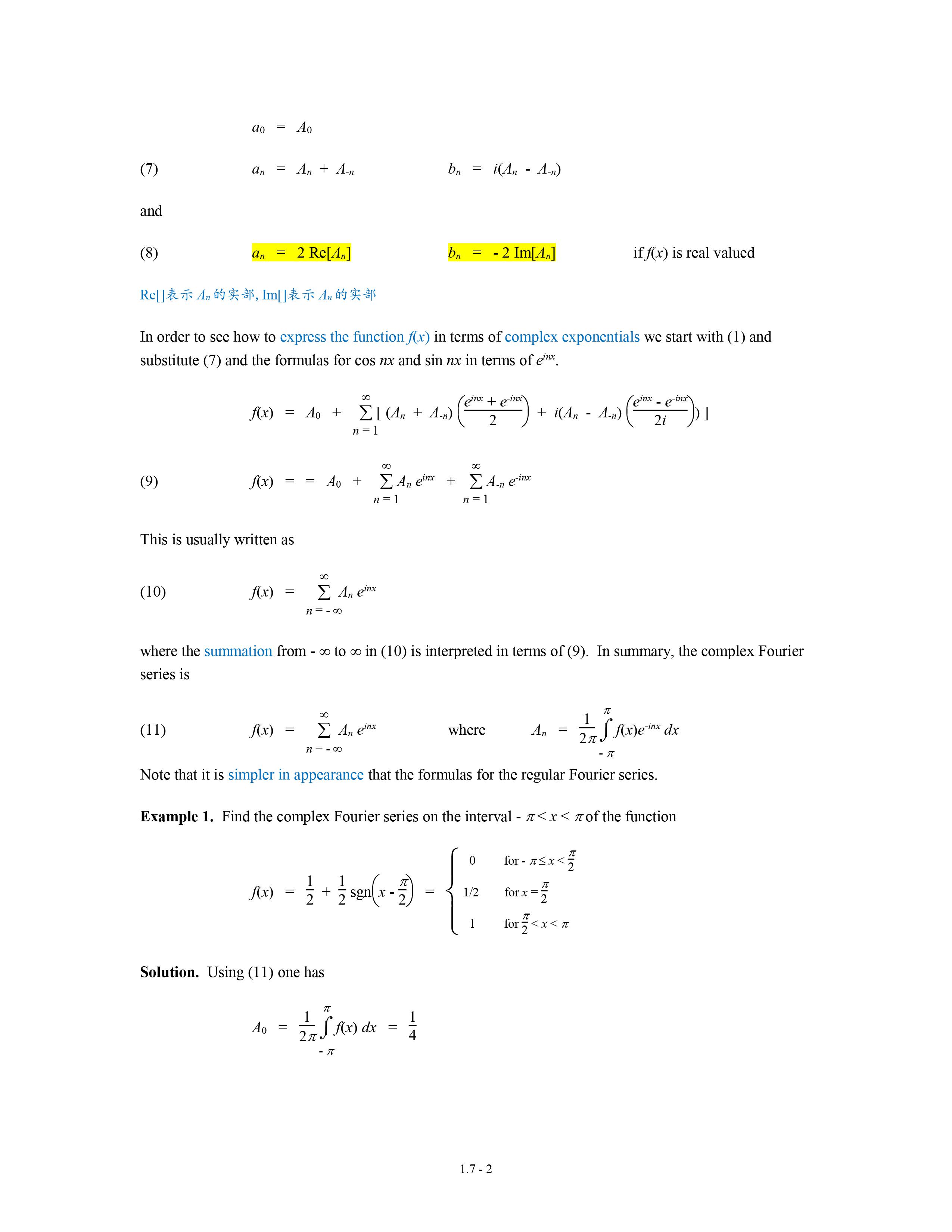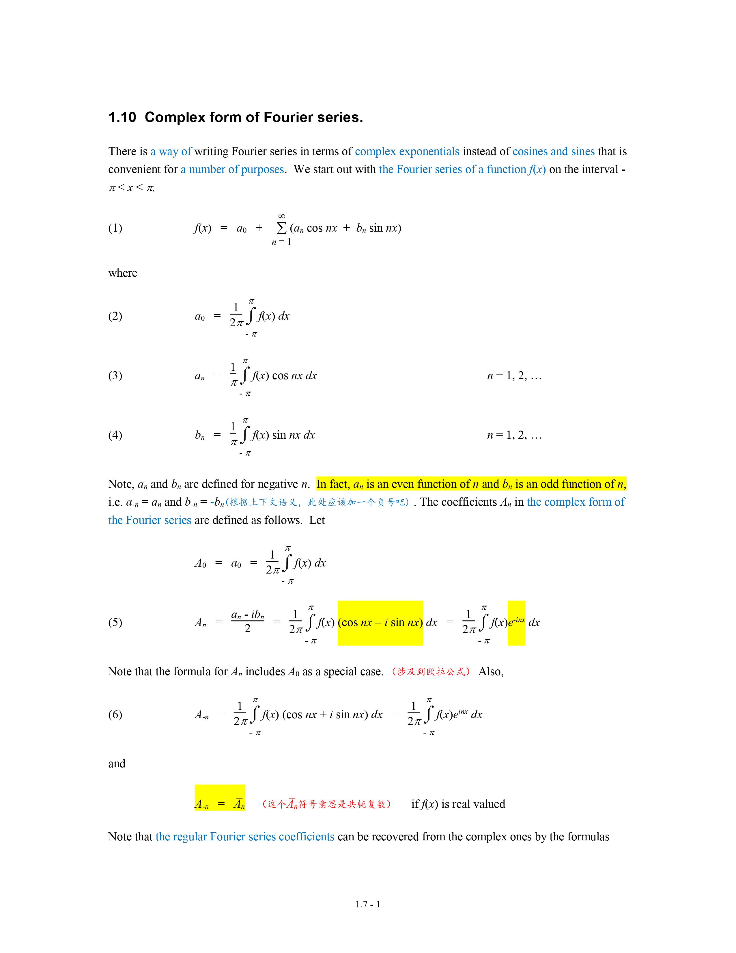 [搬运]Fourier Series and Boundary Value Problems 第一章1.10 Complex form of Fourier series.