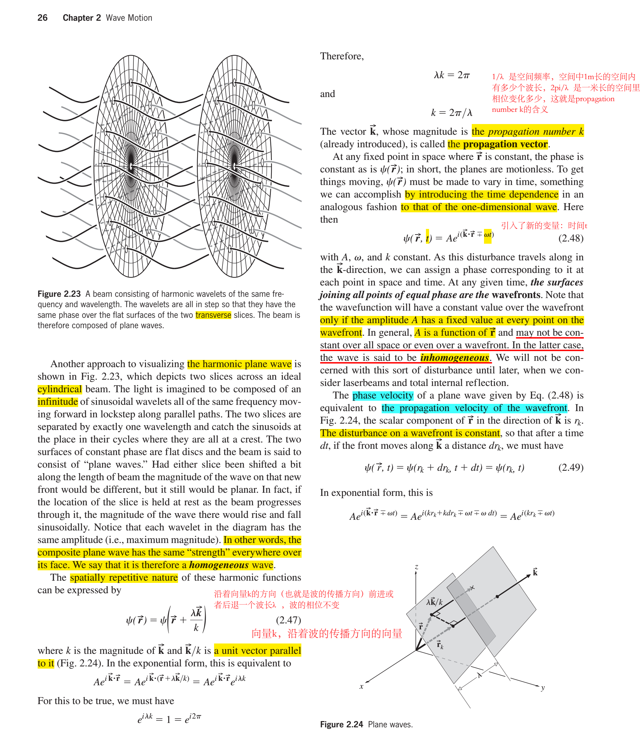 对于公式2.46 $ \psi \left ( \vec{r} \right )=Ae^{i\vec{k}\cdot \vec{r}} $而言,自变量是什么,是在空间的位置$ \vec{k}\cdot \vec{r} $, $ \vec{k} $是指向波传播方向的向量,$ \vec{r} $是任意一个向量,或者说在确定的坐标系中,任何一个点的位置都可以理解成一个从原点出发指向这个点所在位置的向量,$ \vec{r} $是任意一个向量,也可以理解为$ \vec{r} $是空间中任意一个位置,当$ \vec{k}\cdot \vec{r} $是一个常数时,$ \vec{r} $的端点组成的是一个平面,为啥呢?这就涉及到向量点乘的定义,在此不再赘述。在这个平面上$ \vec{k}\cdot \vec{r} $是一个常数,在公式中这个常数表示的是相位,也就是说在这个平面内$ e^{i\vec{k}\cdot \vec{r}} $相位相同。如果$ \vec{k} $指向的是x轴,如图2.22所示,那么$ \psi \left ( \vec{r} \right )=Ae^{i\vec{k}\cdot \vec{r}} $可以简化为$ \psi \left ( \vec{r} \right )=Ae^{ikx} $,此时垂直于x轴的平面上的任何一个点与平面内其他点的相位相同。