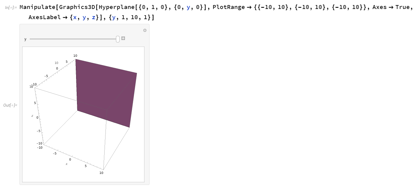Manipulate[Graphics3D[Hyperplane[{0,1,0},{0,y,0}],PlotRange->{{-10,10},{-10,10},{-10,10}},Axes->True,AxesLabel->{x,y,z}],{y,1,10,1}]