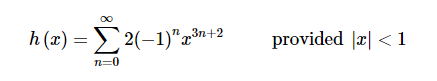 $ g\left( x \right) = \sum\limits_{n = 0}^\infty {{{\left( { - {x^3}} \right)}^n}} \hspace{0.5in}{\mbox{provided }}\left| { - {x^3}} \right| < 1 $