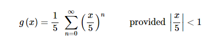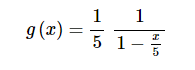 \begin{align*} g\left( x \right) & = \frac{1}{5}\,\,\sum\limits_{n = 0}^\infty {\frac{{{x^n}}}{{{5^n}}}} \\ & = \sum\limits_{n = 0}^\infty {\frac{{{x^n}}}{{{5^{n + 1}}}}} \end{align*}