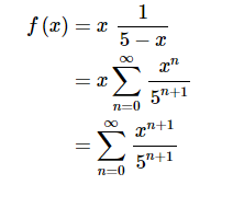 然后我们把 $ f\left( x \right) = \frac{1}{{1 - x}} $ 的幂级数形式中的x替换成x/5,得到
