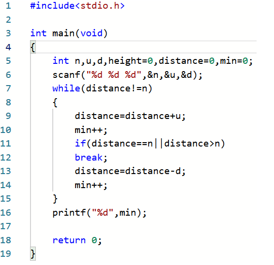 这里要求不足1分钟按1分钟计,并且假定只要在某次上爬过程中蠕虫的头部到达了井的顶部,那么蠕虫就完成任务了。初始时,蠕虫是趴在井底的(即高度为0)。