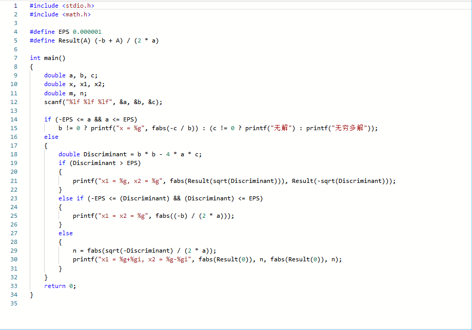 若Δ<0,则输出方程的两个共轭的虚根。