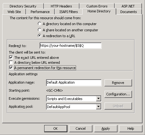 打开IIS -〉站点属性 -〉主目录 -〉选择“重定向到URL” -〉填写https://your-hostname/$S$Q” -〉勾选“资源的永久重定向”