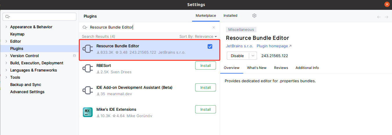 打开设置界面中 Pluggins 菜单,搜索 Resource Bundle Editor 并安装。