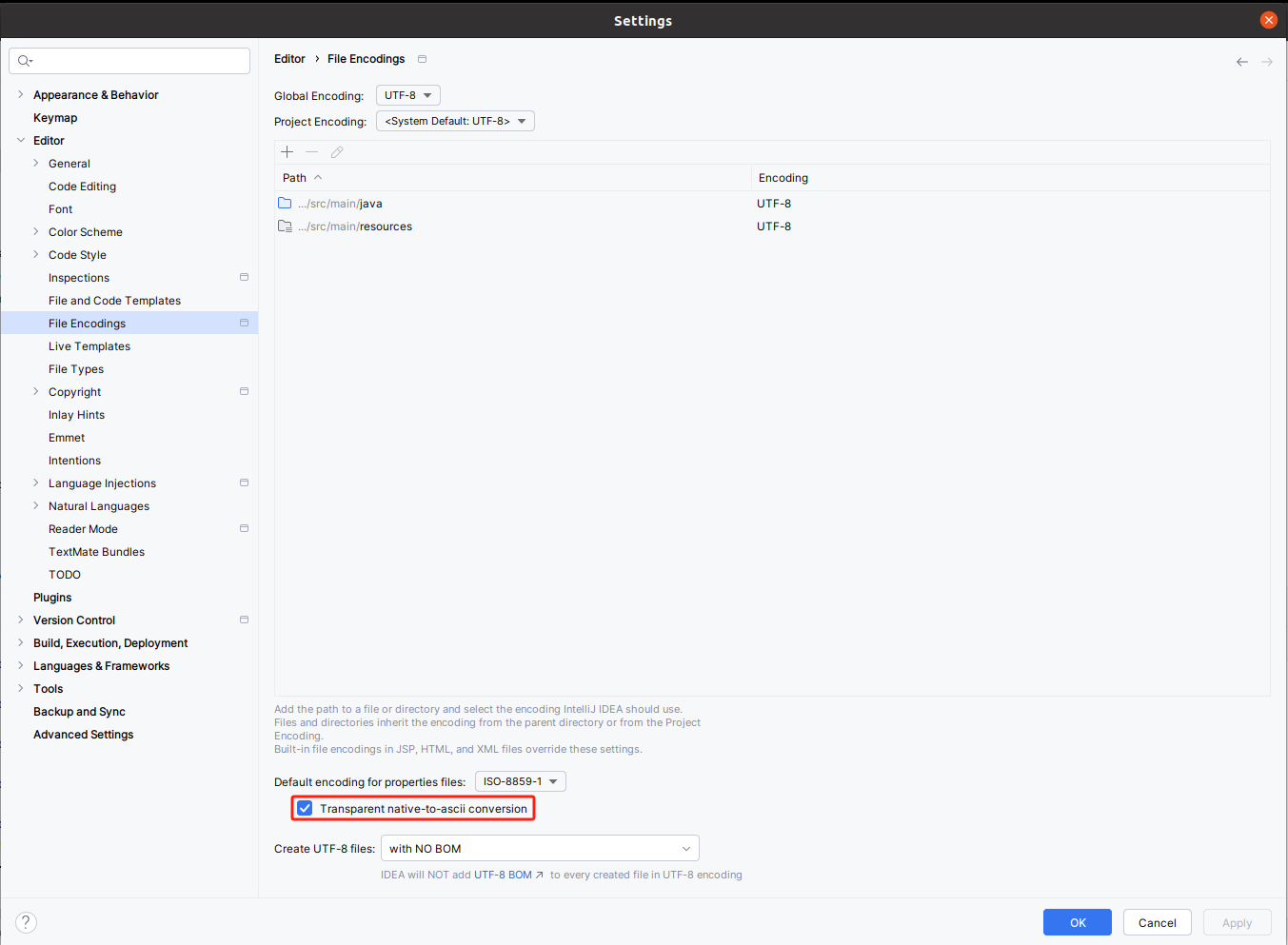 在 File Encoding 设置页面勾选 Transparent native-to-ascii conversion 选项。