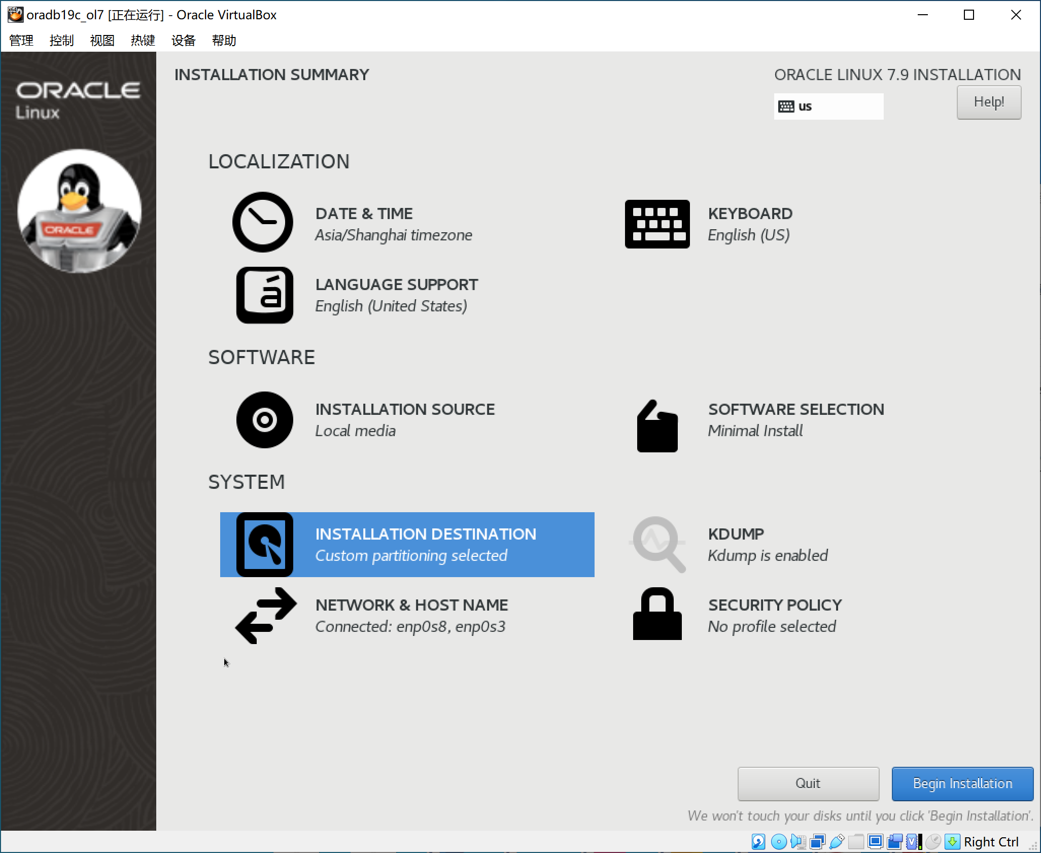操作系统采用 Oracle 数据库推荐的自家的 Oracle Linux 7.9 版本,并使用最小安装,去除不必要的软件包和减小虚拟机磁盘占用。