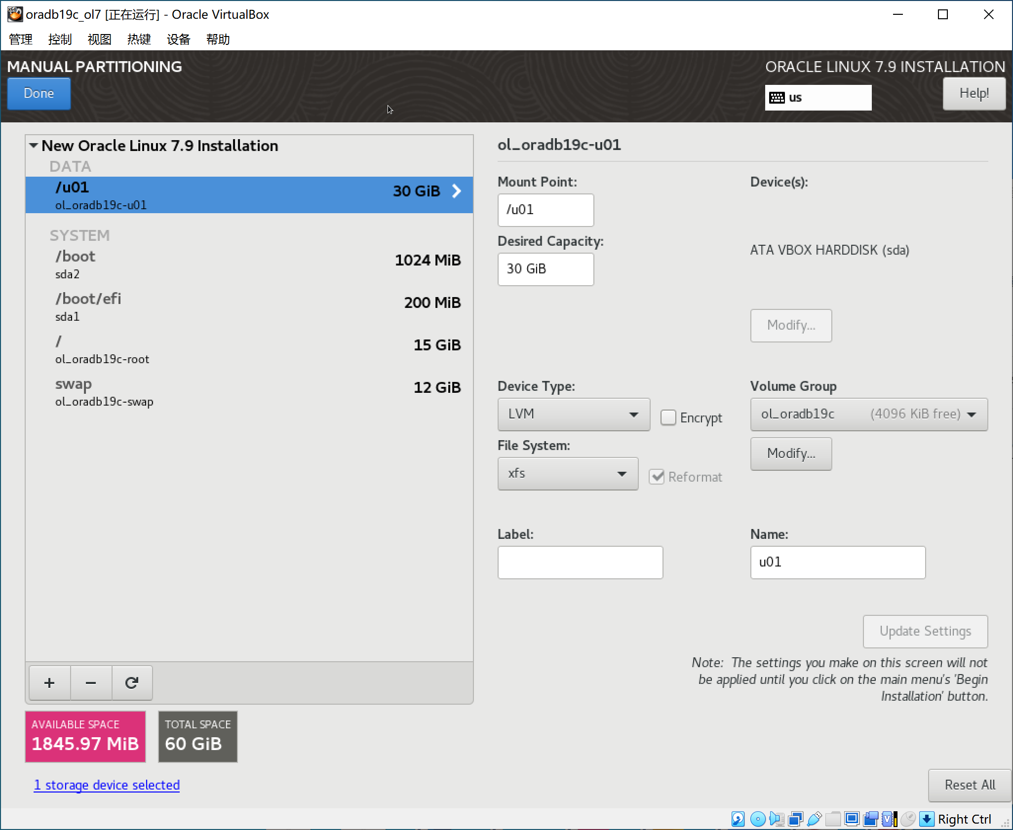 操作系统安装在根分区,15G 空间够用。对于物理内存在 16G 以内的主机,19C 要求交换分区大小应大于等于物理内存大小,这里分配12G。home 分区我们使用量很少,不需要单独分区,所以删除 home 分区。19C 安装的 /u01 目录,我们分配 30G,可以满足单实例数据库安装,新建 u01 分区,大小为 30G。各分区大小见下图。