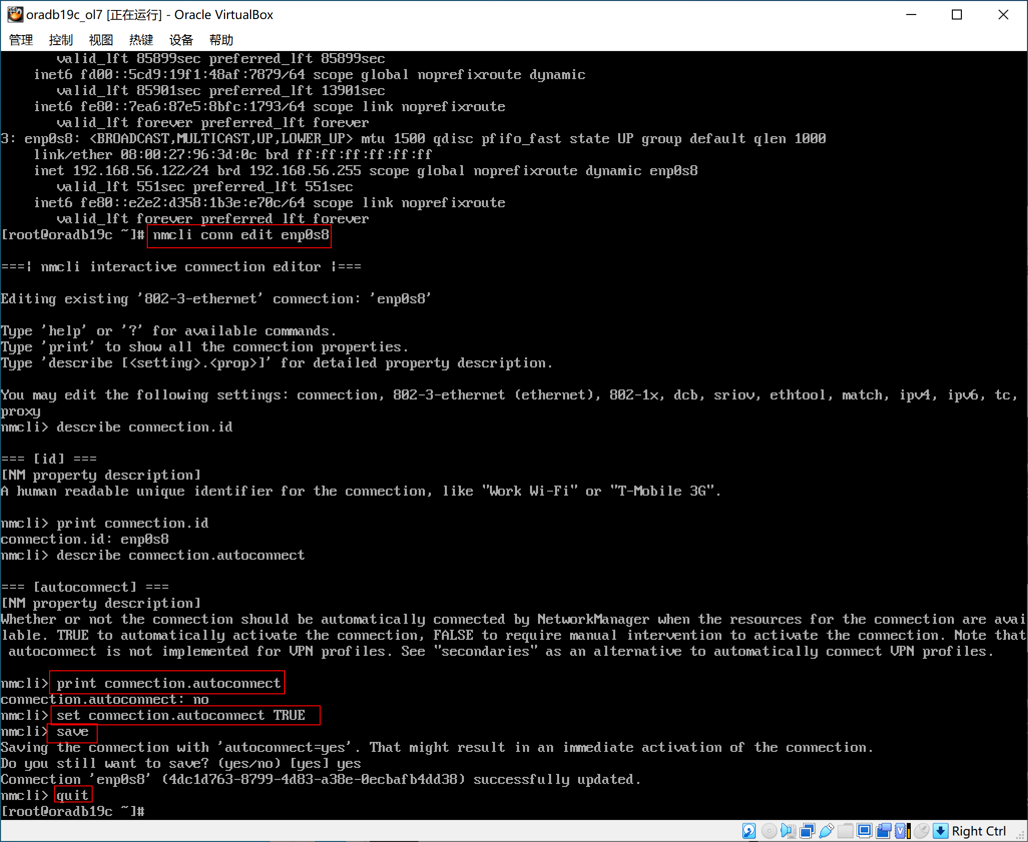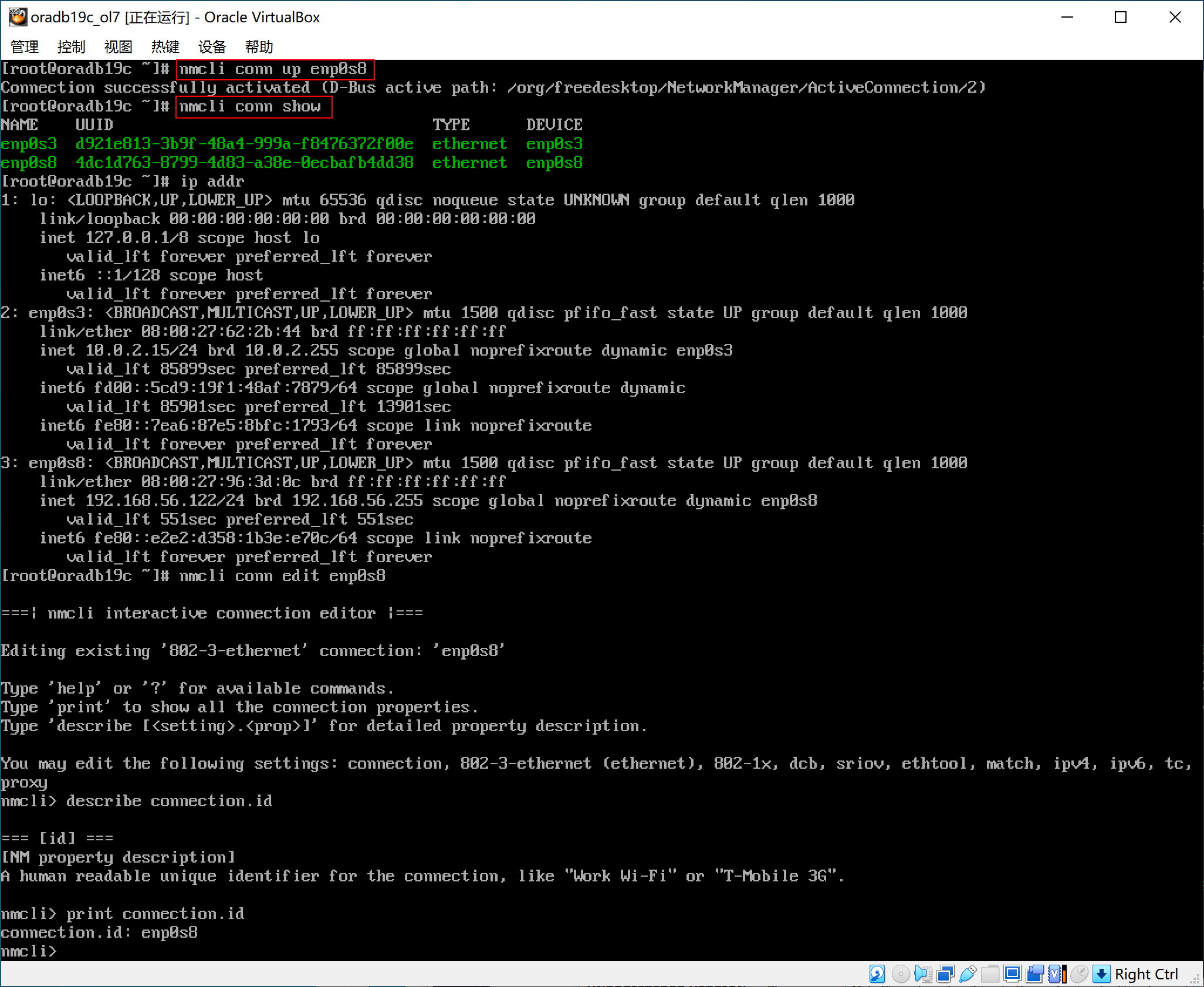 [root@oradb19c ~]# nmcli conn edit enp0s8