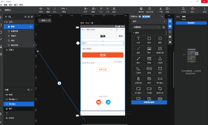首先在组件里将图片作为底片,然后在组件中吧单行输入拖入到账号跟密码处,然后消除边框就实现了输入的功能,从组件中拖入按钮,然后设置好按钮颜色以及字体颜色,然后再把链接区域拖到登录处。