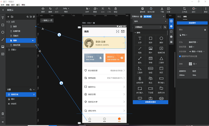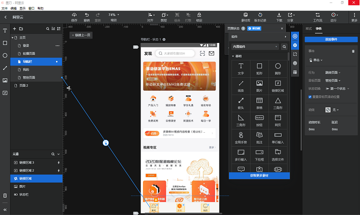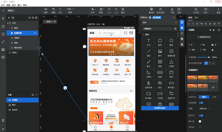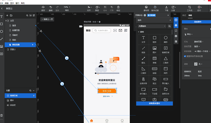 之前老师布置这个作业的时候听上去这个作业很简单,没想到做起来挺麻烦的,在博客园看到这个作业的时候还是一脸懵逼,不知道从何做起,当下载并打开这个软件的时候也很是有点蒙,下载这个软件有个新手教程,也没有对我有很大的帮助,只能每个百度搜索如何操作,参考其他同学是如何做的,看了其他同学的操作觉得无比的复杂,在经过了我两个小时的摸索,终于知道基本操作了,我先是下载阿里云这个软件,然后熟悉这个软件的功能,然后截图,传到电脑中在进行裁剪,裁剪自己需要的轮播图组件,还有其他的组件,再创建新的项目,增加登录页面,轮播图页面,管控页面,我的页面等。在分别进行编辑。