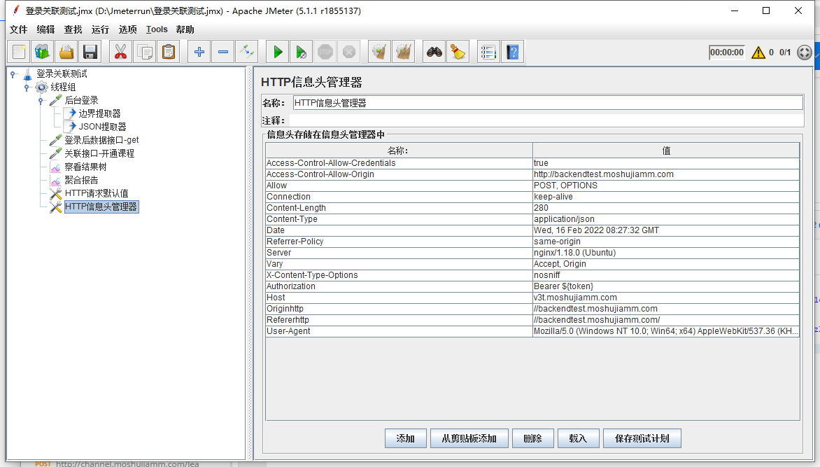 5.HTTP信息头管理器:用于存放接口请求所需要的Headers信息的,还可以存放token等密钥命令等信息,放在线程下多个请求可共用但需要添加对应的请求信息