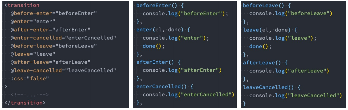 前置:transition组件给我们提供的JavaScript钩子,这些钩子可以帮助我们监听动画执行到什么阶段