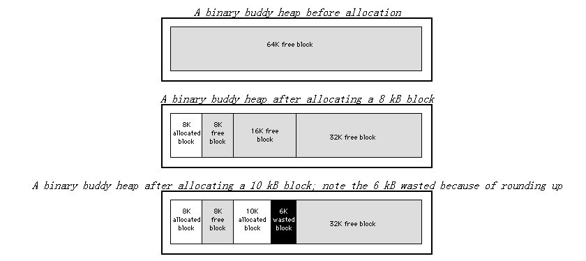 buddy system可以说是segreganted free list的一个变体.它只不过提供了一个受限制的但是高效的分割和组合内存块的算法.在一个简单的buddy结构中,整个内存堆被分为两个块,这两个块就称作一对buddy.而当内存请求到来时,它会像segreganted free list中处理的那样,先将请求大小对齐,然后再递交给buddy system.将会不断地平均切割内存,直到得到一个最小的满足请求的大小的块.而当内存块被释放时,它会尝试合并内存块,而合并内存块的话,一个内存块只能和它的buddy合并.