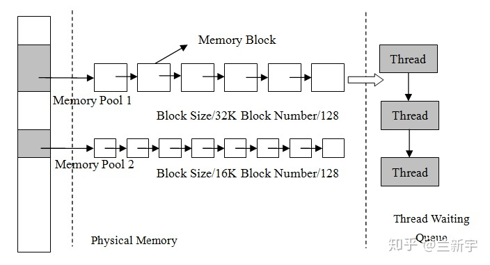 将内存中所有的空闲内存块通过链表的形式组织起来,就形成了最基础的free list。内存分配时,扫描free list的各个空闲内存块,从中找到一个大小满足要求的内存块,并将该内存块从free list中移除。内存释放时,释放的内存块被重新插入到free list中。