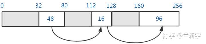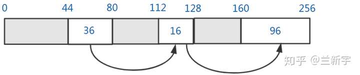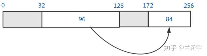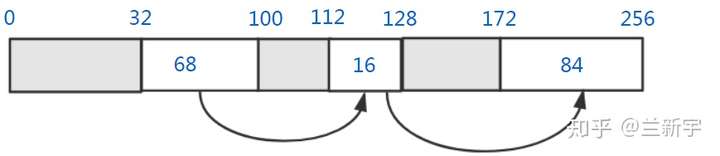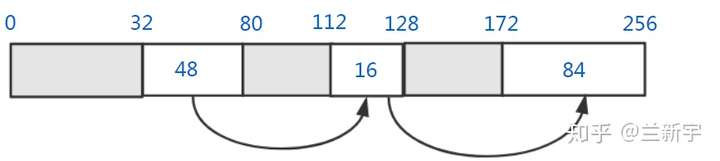- Worst fit(最差适配),也是遍历free list的所有空闲内存块,如果找不到大小刚好匹配的,就从最大的空闲内存块中分配。初看起来很反直觉是不是?但假设接下来的内存申请是64个字节,那只有worst fit的这种方法才能满足需求,所以其价值体现在:分配之后剩下的空闲内存块很可能仍然足够大。