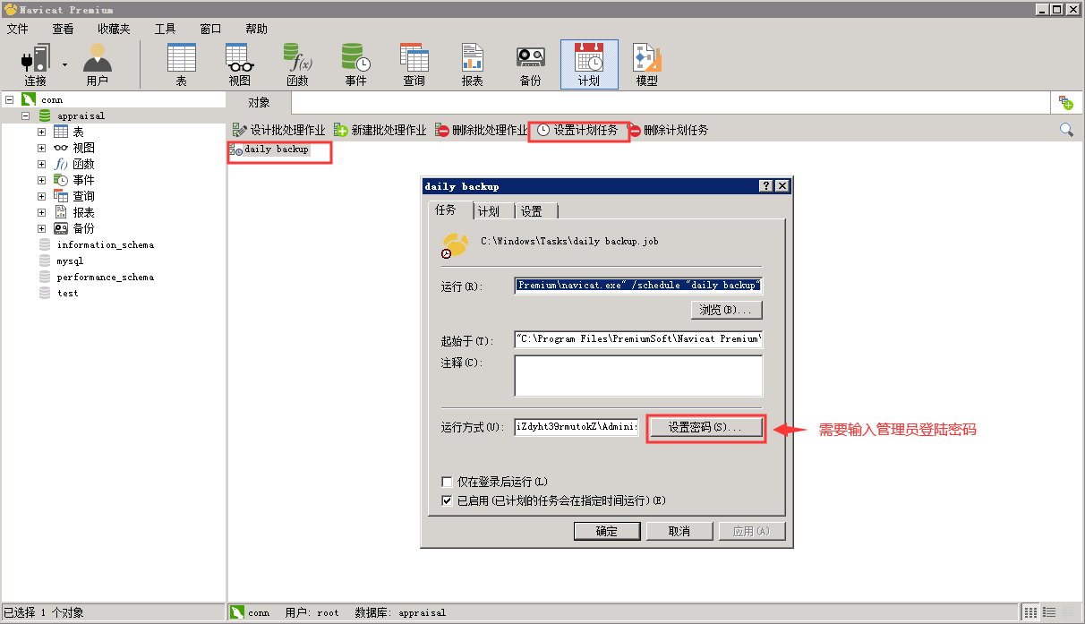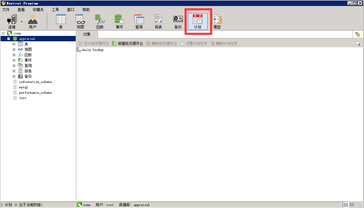 - a. 以navicat premium 11为例,打开连接,打开所需备份数据库,点击菜单"计划",点击工具栏"新建批处理作业"。