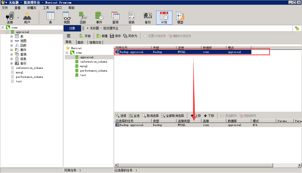 - b. 双击可用任务"Backup appraisal", 选择该任务,输入名称保存该批处理作业。
