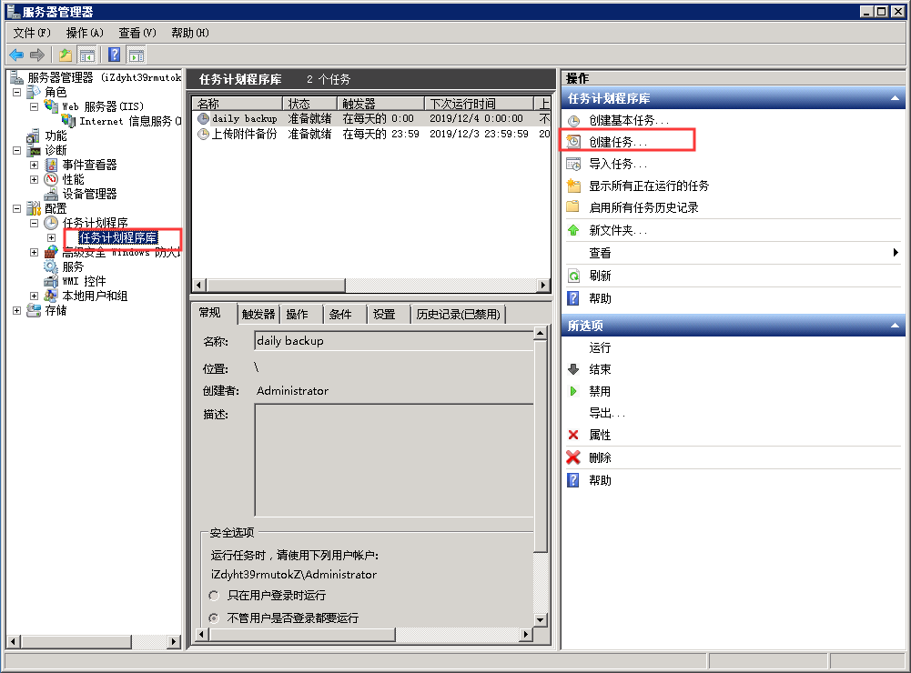 - b.在服务器管理器重选择"任务计划程序","创建任务"