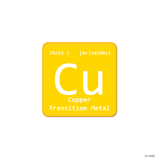 <!DOCTYPE html> <html lang="utf-8"> <meta http-equiv="Content-Type" content="text/html; charset=utf-8"/> <head> <title>铜元素圆角版</title> <style type="text/css"> .centerlize{ margin:0 auto; width:1200px; } </style> </head> <body onload="init();"> <div class="centerlize"> <canvas id="myCanvas" width="12px" height="12px" style="border:1px dotted black;"> 如果看到这段文字说您的浏览器尚不支持HTML5 Canvas,请更换浏览器再试. </canvas> </div> </body> </html> <script type="text/javascript"> <!-- /***************************************************************** * 将全体代码(从<!DOCTYPE到script>)拷贝下来,粘贴到文本编辑器中, * 另存为.html文件,再用chrome浏览器打开,就能看到实现效果。 ******************************************************************/ // canvas的绘图环境 var ctx; // 高宽 const WIDTH=512; const HEIGHT=512; // 舞台对象 var stage; //------------------------------- // 初始化 //------------------------------- function init(){ // 获得canvas对象 var canvas=document.getElementById('myCanvas'); canvas.width=WIDTH; canvas.height=HEIGHT; // 初始化canvas的绘图环境 ctx=canvas.getContext('2d'); ctx.translate(WIDTH/2,HEIGHT/2);// 原点平移 // 准备 stage=new Stage(); stage.init(); // 开幕 animate(); } // 播放动画 function animate(){ stage.update(); stage.paintBg(ctx); stage.paintFg(ctx); // 循环 if(true){ //sleep(100); window.requestAnimationFrame(animate); } } // 舞台类 function Stage(){ // 初始化 this.init=function(){ } // 更新 this.update=function(){ } // 画背景 this.paintBg=function(ctx){ ctx.clearRect(-WIDTH/2,-HEIGHT/2,WIDTH,HEIGHT);// 清屏 } // 画前景 this.paintFg=function(ctx){ // 底色 ctx.save(); ctx.fillStyle = "white"; ctx.fillRect(-WIDTH/2,-HEIGHT/2,WIDTH,HEIGHT); ctx.restore(); const R=210;// 基准尺寸 // 外圈 ctx.save(); ctx.shadowOffsetY=R/100; // 设置阴影 ctx.shadowOffsetX=R/100; ctx.shadowColor="grey"; ctx.shadowBlur=R/100; var r=R*1.00; ctx.fillStyle = "rgb(255,177,0)"; drawRoundRect(ctx,0,0,2*r,2*r,r/6); ctx.fill(); ctx.restore(); // #2圈 ctx.save(); var r=R*0.98; ctx.fillStyle = "rgb(255,201,40)"; drawRoundRect(ctx,0,0,2*r,2*r,r/6); ctx.fill(); ctx.restore(); // #3圈 ctx.save(); var r=R*0.95; ctx.fillStyle = "rgb(255,214,0)"; drawRoundRect(ctx,0,0,2*r,2*r,r/6); ctx.fill(); ctx.restore(); // 元素符号 ctx.save(); var r=R*0.93; ctx.textBaseline="middle"; ctx.textAlign="center"; ctx.font = r*1.4+"px consolas"; ctx.fillStyle="white"; ctx.fillText("Cu",0,r*0.1); ctx.restore(); // 质子数/原子量 ctx.save(); var r=R*0.93; ctx.textBaseline="middle"; ctx.textAlign="center"; ctx.font = r*0.15+"px consolas"; ctx.fillStyle="white"; ctx.fillText("29/63.5",-r*0.58,-r*0.75); ctx.restore(); // 核外电子排布 ctx.save(); var r=R*0.93; ctx.textBaseline="middle"; ctx.textAlign="center"; ctx.font = r*0.15+"px consolas"; ctx.fillStyle="white"; ctx.fillText("[Ar]3d104s1",r*0.45,-r*0.75); ctx.restore(); // 英文名 ctx.save(); var r=R*0.93; ctx.textBaseline="middle"; ctx.textAlign="center"; ctx.font = r*0.2+"px consolas"; ctx.fillStyle="white"; ctx.fillText("Copper",0,r*0.60); ctx.restore(); // 类型 ctx.save(); var r=R*0.93; ctx.textBaseline="middle"; ctx.textAlign="center"; ctx.font = r*0.2+"px consolas"; ctx.fillStyle="white"; ctx.fillText("Transition Metal",0,r*0.84); ctx.restore(); writeText(ctx,WIDTH/2-30,HEIGHT/2-5,"逆火制图","8px consolas","grey");// 版权 } } /*---------------------------------------------------------- 函数:用于绘制倒角矩形 ctx:绘图上下文 x:矩形中心横坐标 y:矩形中心纵坐标 width:矩形宽 height:矩形高 chamferLength:倒角长度 ----------------------------------------------------------*/ function drawChamferedRect(ctx,x,y,width,height,chamferLength){ ctx.beginPath(); ctx.moveTo(x-width/2+chamferLength,y-height/2); ctx.lineTo(x+width/2-chamferLength,y-height/2); ctx.lineTo(x+width/2,y-height/2+chamferLength); ctx.lineTo(x+width/2,y+height/2-chamferLength); ctx.lineTo(x+width/2-chamferLength,y+height/2); ctx.lineTo(x-width/2+chamferLength,y+height/2); ctx.lineTo(x-width/2,y+height/2-chamferLength); ctx.lineTo(x-width/2,y-height/2+chamferLength); ctx.closePath(); } /*---------------------------------------------------------- 函数:用于绘制圆角矩形 ctx:绘图上下文 x:矩形中心横坐标 y:矩形中心纵坐标 width:矩形宽 height:矩形高 radius:圆角半径 ----------------------------------------------------------*/ function drawRoundRect(ctx,x,y,width,height,radius){ ctx.beginPath(); ctx.moveTo(x-width/2+radius,y-height/2); ctx.lineTo(x+width/2-radius,y-height/2); ctx.arcTo(x+width/2,y-height/2,x+width/2,y-height/2+radius,radius); ctx.lineTo(x+width/2,y-height/2+radius); ctx.lineTo(x+width/2,y+height/2-radius); ctx.arcTo(x+width/2,y+height/2,x+width/2-radius,y+height/2,radius); ctx.lineTo(x+width/2-radius,y+height/2); ctx.lineTo(x-width/2+radius,y+height/2); ctx.arcTo(x-width/2,y+height/2,x-width/2,y+height/2-radius,radius); ctx.lineTo(x-width/2,y+height/2-radius); ctx.lineTo(x-width/2,y-height/2+radius); ctx.arcTo(x-width/2,y-height/2,x-width/2+radius,y-height/2,radius); ctx.closePath(); } /*---------------------------------------------------------- 函数:用于绘制矩形 ctx:绘图上下文 x:矩形中心横坐标 y:矩形中心纵坐标 width:矩形宽 height:矩形高 ----------------------------------------------------------*/ function drawRect(ctx,x,y,width,height){ ctx.beginPath(); ctx.moveTo(x-width/2,y-height/2); ctx.lineTo(x+width/2,y-height/2); ctx.lineTo(x+width/2,y+height/2); ctx.lineTo(x-width/2,y+height/2); ctx.closePath(); } /*---------------------------------------------------------- 函数:用于绘制实心圆,用途是标记点以辅助作图 ctx:绘图上下文 x:矩形中心横坐标 y:矩形中心纵坐标 r:圆半径 color:填充圆的颜色 ----------------------------------------------------------*/ function drawSolidCircle(ctx,x,y,r,color){ 