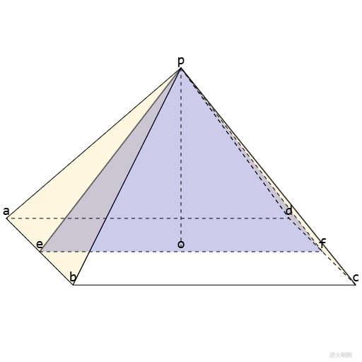 <!DOCTYPE html> <html lang="utf-8"> <meta http-equiv="Content-Type" content="text/html; charset=utf-8"/> <head> <title>四棱锥二面角 Draft1</title> <style type="text/css"> .centerlize{ margin:0 auto; width:1200px; } </style> </head> <body onload="init();"> <div class="centerlize"> <canvas id="myCanvas" width="12px" height="12px" style="border:1px dotted black;"> 如果看到这段文字说您的浏览器尚不支持HTML5 Canvas,请更换浏览器再试. </canvas> </div> </body> </html> <script type="text/javascript"> <!-- /***************************************************************** * 将全体代码(从<!DOCTYPE到script>)拷贝下来,粘贴到文本编辑器中, * 另存为.html文件,再用chrome浏览器打开,就能看到实现效果。 ******************************************************************/ // canvas的绘图环境 var ctx; // 高宽 const WIDTH=512; const HEIGHT=512; // 舞台对象 var stage; //------------------------------- // 初始化 //------------------------------- function init(){ // 获得canvas对象 var canvas=document.getElementById('myCanvas'); canvas.width=WIDTH; canvas.height=HEIGHT; // 初始化canvas的绘图环境 ctx=canvas.getContext('2d'); ctx.translate(WIDTH/2,HEIGHT/2);// 原点平移 // 准备 stage=new Stage(); stage.init(); // 开幕 animate(); } // 播放动画 function animate(){ stage.update(); stage.paintBg(ctx); stage.paintFg(ctx); // 循环 if(true){ //sleep(100); window.requestAnimationFrame(animate); } } // 舞台类 function Stage(){ // 初始化 this.init=function(){ } // 更新 this.update=function(){ } // 画背景 this.paintBg=function(ctx){ ctx.clearRect(-WIDTH/2,-HEIGHT/2,WIDTH,HEIGHT);// 清屏 } // 画前景 this.paintFg=function(ctx){ // 底色 //ctx.save(); //ctx.fillStyle = "black"; //ctx.fillRect(-WIDTH/2,-HEIGHT/2,WIDTH,HEIGHT); //ctx.restore(); const R=200;//基准尺寸 ctx.lineWidth=R/200*1; // #1 ctx.save(); var r=R*1.00; // 定位 var o=createPt(0,r/2); var p=createPt2(o.x,o.y,r*1.3,-Math.PI/2); var f=createPt2(o.x,o.y,r,0); var d=createPt2(f.x,f.y,r/3,-Math.PI/4*3); var c=createPt2(f.x,f.y,r/3,+Math.PI/4*1); var e=createPt2(o.x,o.y,r,Math.PI); var a=createPt2(e.x,e.y,r/3,-Math.PI/4*3); var b=createPt2(e.x,e.y,r/3,+Math.PI/4*1); // PAB ctx.save(); ctx.strokeStyle="black"; ctx.fillStyle="rgba(255,241,203,0.6)"; ctx.beginPath(); ctx.moveTo(a.x,a.y); ctx.lineTo(p.x,p.y); ctx.lineTo(b.x,b.y); ctx.closePath(); ctx.fill(); ctx.stroke(); ctx.restore(); // PBC ctx.save(); ctx.strokeStyle="black"; ctx.beginPath(); ctx.moveTo(b.x,b.y); ctx.lineTo(c.x,c.y); ctx.lineTo(p.x,p.y); ctx.closePath(); ctx.stroke(); ctx.restore(); // PCD ctx.save(); ctx.strokeStyle="black"; ctx.setLineDash([5,5]); ctx.fillStyle="rgba(255,241,203,0.6)"; ctx.beginPath(); ctx.moveTo(c.x,c.y); ctx.lineTo(d.x,d.y); ctx.lineTo(p.x,p.y); ctx.fill(); ctx.stroke(); ctx.restore(); // PAD ctx.save(); ctx.strokeStyle="black"; ctx.setLineDash([5,5]); ctx.beginPath(); ctx.lineTo(p.x,p.y); ctx.lineTo(d.x,d.y); ctx.lineTo(a.x,a.y); ctx.stroke(); ctx.restore(); // EFP ctx.save(); ctx.strokeStyle="black"; ctx.setLineDash([5,5]); ctx.fillStyle="rgba(0,0,150,0.2)"; ctx.beginPath(); ctx.lineTo(e.x,e.y); ctx.lineTo(f.x,f.y); ctx.lineTo(p.x,p.y); ctx.stroke(); ctx.fill(); ctx.restore(); // PE ctx.save(); ctx.strokeStyle="black"; ctx.beginPath(); ctx.moveTo(p.x,p.y); ctx.lineTo(e.x,e.y); ctx.stroke(); ctx.restore(); // PC ctx.save(); ctx.strokeStyle="black"; ctx.beginPath(); ctx.moveTo(p.x,p.y); ctx.lineTo(c.x,c.y); ctx.stroke(); ctx.restore(); // PO ctx.save(); ctx.strokeStyle="black"; ctx.setLineDash([5,5]); ctx.beginPath(); ctx.moveTo(p.x,p.y); ctx.lineTo(o.x,o.y); ctx.stroke(); ctx.restore(); // 标注点 writeText(ctx,a.x,a.y,"a",r*0.1+"px consolas","black"); writeText(ctx,b.x,b.y,"b",r*0.1+"px consolas","black"); writeText(ctx,c.x,c.y,"c",r*0.1+"px consolas","black"); writeText(ctx,d.x,d.y,"d",r*0.1+"px consolas","black"); writeText(ctx,e.x,e.y,"e",r*0.1+"px consolas","black"); writeText(ctx,f.x,f.y,"f",r*0.1+"px consolas","black"); writeText(ctx,p.x,p.y,"p",r*0.1+"px consolas","black"); writeText(ctx,o.x,o.y,"o",r*0.1+"px consolas","black"); ctx.restore(); writeText(ctx,WIDTH/2-30,HEIGHT/2-5,"逆火制图","8px consolas","lightgrey");// 版权 } } /*---------------------------------------------------------- 函数:用于绘制矩形 ctx:绘图上下文 x:矩形中心横坐标 y:矩形中心纵坐标 width:矩形宽 height:矩形高 ----------------------------------------------------------*/ function drawRect(ctx,x,y,width,height){ ctx.beginPath(); ctx.moveTo(x-width/2,y-height/2); ctx.lineTo(x+width/2,y-height/2); ctx.lineTo(x+width/2,y+height/2); ctx.lineTo(x-width/2,y+height/2); ctx.closePath(); } /*---------------------------------------------------------- 函数:用于绘制实心圆 ctx:绘图上下文 x:矩形中心横坐标 y:矩形中心纵坐标 r:圆半径 style:填充圆的方案 ----------------------------------------------------------*/ function drawSolidCircle(ctx,x,y,r,style){ ctx.fillStyle=style; ctx.beginPath(); ctx.arc(x,y,r,0,Math.PI*2,false); ctx.closePath(); ctx.fill(); } /*---------------------------------------------------------- 函数:创建一个二维坐标点 baseX:基准点横坐标 baseY:基准点纵坐标 radius:当前点到基准点的距离(辐长) theta:当前点到基准点的角度(辐角) Pt即Point ----------------------------------------------------------*/ function createPt2(baseX,baseY,radius,theta){ var pt={}; pt.x=baseX+radius*Math.cos(theta); pt.y=baseY+radius*Math.sin(theta); return pt; } /*---------------------------------------------------------- 函数:创建一个二维坐标点 x:横坐标 y:纵坐标 Pt即Point ----------------------------------------------------------*/ function createPt(x,y){ var retval={}; retval.x=x; retval.y=y; return retval; } /*---------------------------------------------------------- 函数:延时若干毫秒 milliseconds:毫秒数 -------------------------------------------------