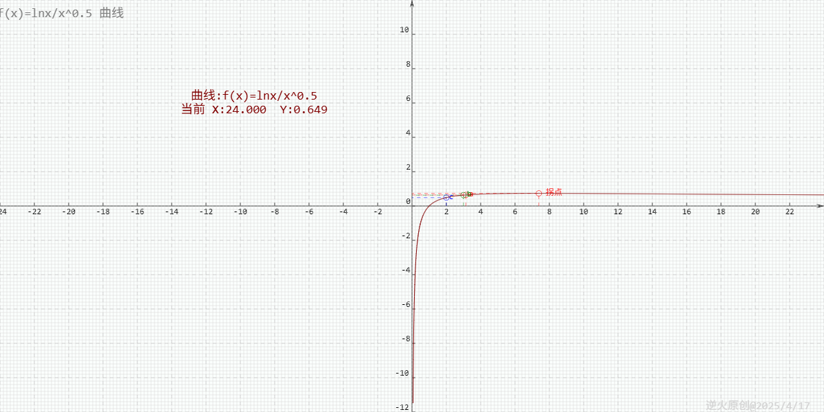 <!DOCTYPE html> <html lang="utf-8"> <meta http-equiv="Content-Type" content="text/html; charset=utf-8"/> <head> <title>UNASSIGNED</title> <style type="text/css"> .centerlize{ margin:0 auto; border:0px solid red; width:1200px;height:600px; } </style> </head> <body onload="draw();"> <div class="centerlize"> <canvas id="myCanvas" width="10px" height="10px" style="border:1px dashed black;"> 如果看到这段文字说您的浏览器尚不支持HTML5 Canvas,请更换浏览器再试. </canvas> </div> </body> </html> <script type="text/javascript"> <!-- /***************************************************************** * 将全体代码拷贝下来,粘贴到文本编辑器中,另存为.html文件, * 再用chrome浏览器打开,就能看到动画效果。 ******************************************************************/ // 系统常量定义处 const TITLE="f(x)=lnx/x^0.5 曲线"; // 图像标题 const WIDTH=1200; // 画布宽度 const HEIGHT=600; // 画布高度 const SCALE_UNIT=100; // 缩放比例 25对应x∈[-24,24],100对应x∈[-6,6] // 系统变量定义处 var context=0; // 画布环境 var stage; // 舞台对象 var timeElapsed=0; // 动画运作的的时间 const TIME_END=100000; // 动画运作的期限 //------------------------------- // Canvas开始运作,由body_onload调用 //------------------------------- function draw(){ document.title=TITLE; // 画图前初始化 var canvas=document.getElementById('myCanvas'); canvas.width=WIDTH; canvas.height=HEIGHT; context=canvas.getContext('2d'); // 进行屏幕坐标系到笛卡尔坐标系的变换 // 处置完成前,原点在左上角,向右为X正向,向下为Y的正向 // 处置完毕后,原点移动到画布中央,向右为X正向,向上为Y的正向 context.translate(WIDTH/2,HEIGHT/2); context.rotate(Math.PI); context.scale(-1,1); // 初始化舞台 stage=new Stage(); // 开始动画 animate(); }; //------------------------------- // 画图 //------------------------------- function animate(){ timeElapsed+=1;// 时间每轮增加1 stage.update(timeElapsed); stage.paintBg(context); stage.paint(context); if(timeElapsed<TIME_END){ window.requestAnimationFrame(animate); } } //------------------------------- // 舞台对象定义处 //------------------------------- function Stage(){ // 内置对象(非必要勿更改) var obj=new Object; // 对象下的曲线数组(非必要勿更改) obj.curves=[]; // 塞入曲线1(按需修改设定项) obj.curves.push({ name:"曲线:f(x)=lnx/x^0.5", xEnd:24, x:0, y:0, setY:function(x){ this.y=Math.log(x)/Math.sqrt(x);// 解析式 let coord={"x":x,"y":this.y}; this.pts0.push(coord); }, "pts0":[], }); // 随时间更新位置(非必要勿更改) obj.update=function(t){ for(var i=0;i<this.curves.length;i++){ var curve=this.curves[i]; if(curve.x<curve.xEnd){ curve.x+=0.01; curve.setY(curve.x); } } }; // 画前景 obj.paint=function(ctx){ // 手动标记点 paintPoint(ctx,Math.E*Math.E,2/Math.E,"拐点","red"); paintPoint(ctx,Math.PI,Math.log(Math.PI)/Math.sqrt(Math.PI),"a","red"); paintPoint(ctx,3,Math.log(3)/Math.sqrt(3),"b","green"); paintPoint(ctx,2,Math.log(2)/Math.sqrt(2),"c","blue"); // 文字左上角位置(可手动修改设定值) const X_START=-230; // 文字横起点 const Y_START=150; // 文字纵起点 const OFFSET=50; // 文字间隔 // 遍历曲线数组(非必要勿更改) for(var i=0;i<this.curves.length;i++){ var curve=this.curves[i]; var color=getColor(i); // 曲线名称 drawText(ctx,curve.name,X_START,Y_START-i*OFFSET,color,18); // 曲线当前点坐标 drawText(ctx,"当前 X:"+curve.x.toFixed(3)+" Y:"+curve.y.toFixed(3),X_START,Y_START-20-(i)*OFFSET,color,18); // 绘制曲线 if(curve.pts0){ paintCurve(ctx,color,curve.pts0); // 绘制曲线分段1的高低点(可选) //var mm=findMaxMin(curve.pts0); //markMaxMin(ctx,mm,color); } if(curve.pts1){ paintCurve(ctx,color,curve.pts1); // 绘制曲线分段2的高低点(可选) //var mm=findMaxMin(curve.pts1); //markMaxMin(ctx,mm,color); } if(curve.pts2){ paintCurve(ctx,color,curve.pts2); // 绘制曲线分段3的高低点(可选) //var mm=findMaxMin(curve.pts2); //markMaxMin(ctx,mm,color); } if(curve.pts3){ paintCurve(ctx,color,curve.pts3); // 绘制曲线分段4的高低点(可选) //var mm=findMaxMin(curve.pts3); //markMaxMin(ctx,mm,color); } if(curve.pts4){ paintCurve(ctx,color,curve.pts4); // 绘制曲线分段4的高低点(可选) //var mm=findMaxMin(curve.pts3); //markMaxMin(ctx,mm,color); } } }; // 画背景(非必要不更改) obj.paintBg=function(ctx){ // 清屏 ctx.clearRect(-600,-300,1200,600); ctx.fillStyle="rgb(251,255,253)"; ctx.fillRect(-600,-300,1200,600); // 画X轴 drawAxisX(ctx,-600,600,50); // 画Y轴 drawAxisY(ctx,-300,300,50); // 画网格线 drawGrid(ctx,-600,-300,50,1200,600,50); // 左上角标题 var metrics = ctx.measureText(TITLE); var textWidth = metrics.width; drawText(ctx,TITLE,-WIDTH/2+textWidth+3,HEIGHT/2-30,"grey",18); // 右下角作者,日期 const waterMarkTxt="逆火原创@"+(new Date()).toLocaleDateString(); metrics = ctx.measureText(waterMarkTxt); textWidth = metrics.width; drawText(ctx,waterMarkTxt,WIDTH/2-textWidth,-HEIGHT/2,"lightGrey",16); }; return obj; } // 描绘并标识一个点 function paintPoint(ctx,x,y,text,color){ var xReal=x*SCALE_UNIT; var yReal=y*SCALE_UNIT; ctx.strokeStyle=color; ctx.lineWidth=0.5; // 点划线 ctx.save(); ctx.setLineDash([5,5]); ctx.beginPath(); ctx.moveTo(xReal,0); ctx.lineTo(xReal,yReal); ctx.lineTo(0,yReal); ctx.stroke(); ctx.restore(); // 画圈 ctx.beginPath(); ctx.arc(xReal,yReal,4,0,Math.PI*2,false); ctx.closePath(); ctx.stroke(); // 写文字 var metrics = ctx.measureText(text); var textWidth = metrics.width; drawText(ctx,text,xReal+textWidth+2,yReal-5,color,12); } // 连点成线画曲线 function paintCurve(ctx,color,cds){ ctx.save(); ctx.strokeStyle = color; ctx.lineWidth=1; ctx.beginPath(); for(var i=0; i<cds.length; i++){ let y=cds[i].y; if(Math.abs(cds[i].y*SCALE_UNIT)<300){ ctx.lineTo(cds[i].x*SCALE_UNIT,cds[i].y*SCALE_UNIT); } } ctx.stroke(); ct