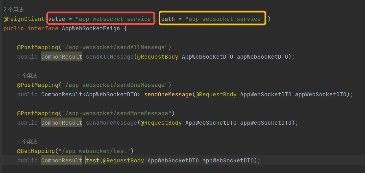 在服务的消费端,有一个AppWebSocketFeign接口,是对调用第三方服务的接口封装;