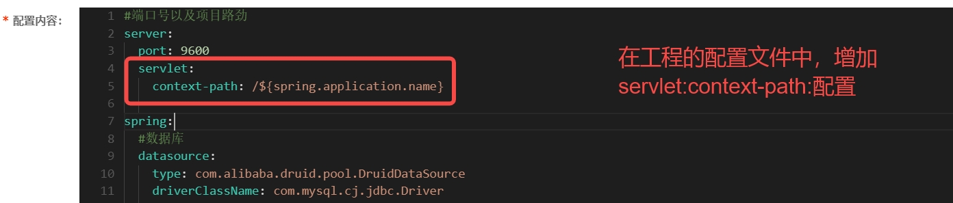 在工程对应的nacos配置文件中,添加servlet:context-path的配置,值为服务的应用名称即可: