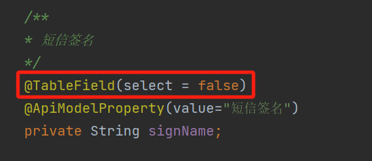 比如:不想被查出来signName字段的值,就可以使用@TableField(select = false)注解。