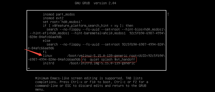 (3)修改完成后,按 F10 或 crtl + x 会根据当前的启动项启动一个 bash 进程