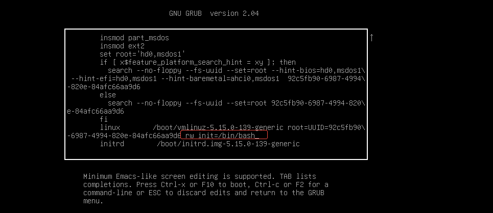 rw init=/bin/bash