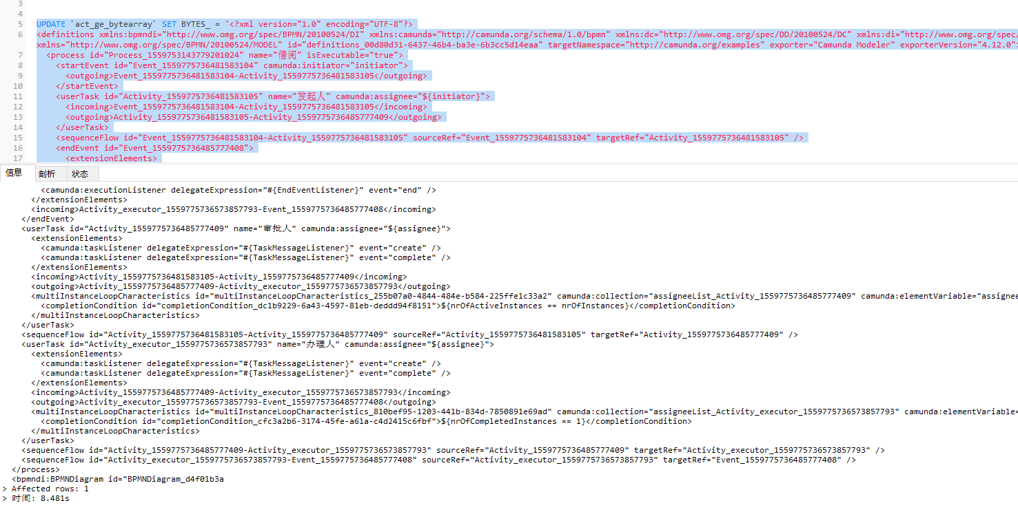 UPDATE `act_ge_bytearray` SET BYTES_ = 'xml字符串' WHERE ID_ = 'e4e532d0-c146-11ec-b630-18f22c5016b2';