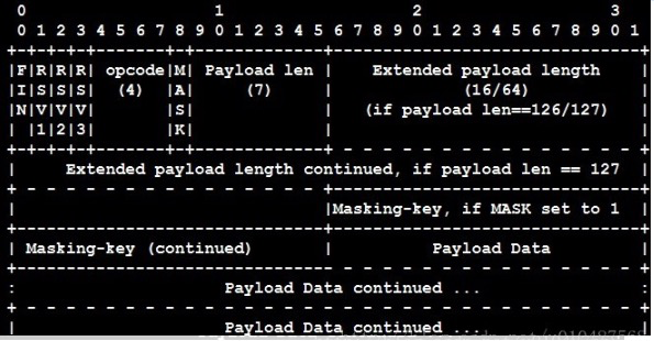 opcode:占4位,用于表示消息接收类型;0x0表示附加数据帧;0x1表示文本数据帧;0x2表示二进制数据帧;