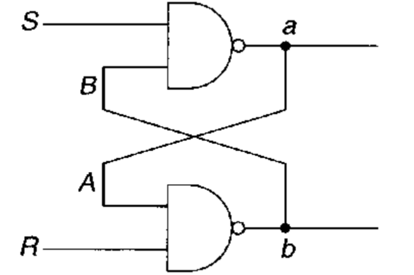 我的理解原文可能是:一个NAND门的输出是另外一个NAND门的输入。也就是说S端的值相当于存储在b端,R端的值相当于存储在a端。这样和后文作者的说法也能对上了。(只是我个人的理解,不一定对,有错欢迎喷我)