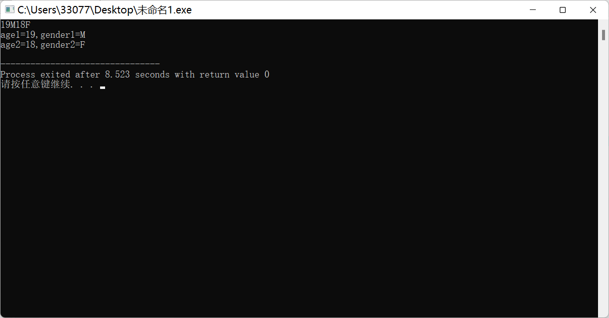 #include<stdio.h> int main() { int age1,age2; char gender1,gender2; scanf("%d%c%d%c",&age1,&gender1,&age2,&gender2); printf("age1=%d,gender1=%c\n",age1,gender1); printf("age2=%d,gender2=%c\n",age2,gender2); return 0; }