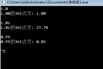 #include <stdio.h> #include <math.h> int main() { double x, ans; while(scanf("%lf", &x) != EOF) { ans = pow(x, 365); printf("%.2f的365次方: %.2f\n", x, ans); printf("\n"); } return 0; }