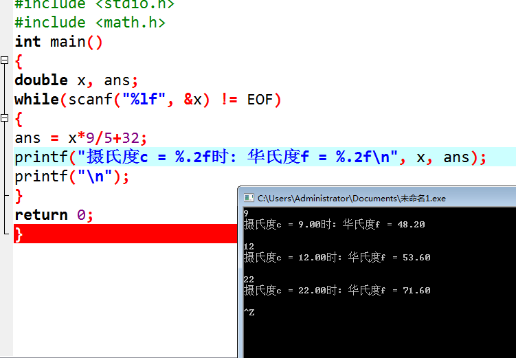 #include <stdio.h> #include <math.h> int main() { double x, ans; while(scanf("%lf", &x) != EOF) { ans = x*9/5+32; printf("摄氏度c = %.2f时: 华氏度f = %.2f\n", x, ans); printf("\n"); } return 0; }