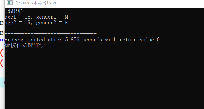 #include <stdio.h> int main() { int age1, age2; char gender1, gender2; scanf("%d%c%d%c", &age1, &gender1, &age2, &gender2); printf("age1 = %d, gender1 = %c\n", age1, gender1); printf("age2 = %d, gender2 = %c\n", age2, gender2); return 0; }