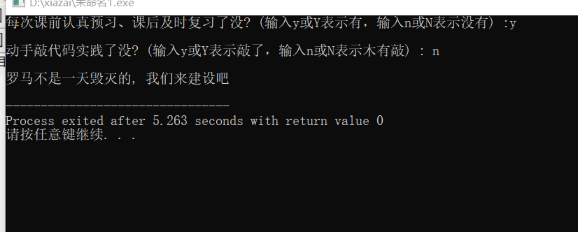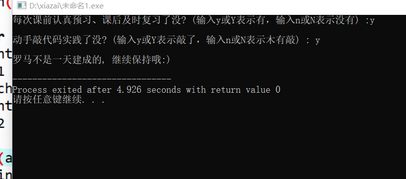 #include<stdio.h> int main() { char ans1, ans2,y,Y; printf("每次课前认真预习、课后及时复习了没? (输入y或Y表示有,输入n或N表示没有) :"); ans1 = getchar(); getchar(); printf("\n动手敲代码实践了没? (输入y或Y表示敲了,输入n或N表示木有敲) : "); ans2 = getchar(); if((ans1 == 'y' || ans1 == 'Y') && (ans2 == 'y' || ans2 == 'Y')) printf("\n罗马不是一天建成的, 继续保持哦:)\n"); else printf("\n罗马不是一天毁灭的, 我们来建设吧\n"); return 0; }