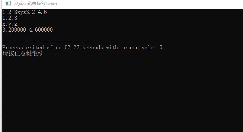 #include<stdio.h> int main() { int a1,a2,a3; char c1, c2, c3; double x, y; scanf("%d%d%d",&a1,&a2,&a3); //改 printf("%d,%d,%d\n", a1, a2, a3); scanf("%c%c%c",&c1,&c2,&c3); printf("%c,%c,%c\n", c1, c2, c3); scanf("%lf%lf", &x, &y); //改 printf("%lf,%lf\n", x, y); return 0; }