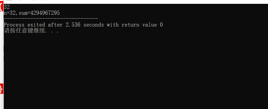 #include<stdio.h> #include<math.h> int main() { unsigned int n,sum; scanf("%d",&n); sum = pow(2, n) - 1; printf("n=%u,sum=%u",n,sum); return 0;