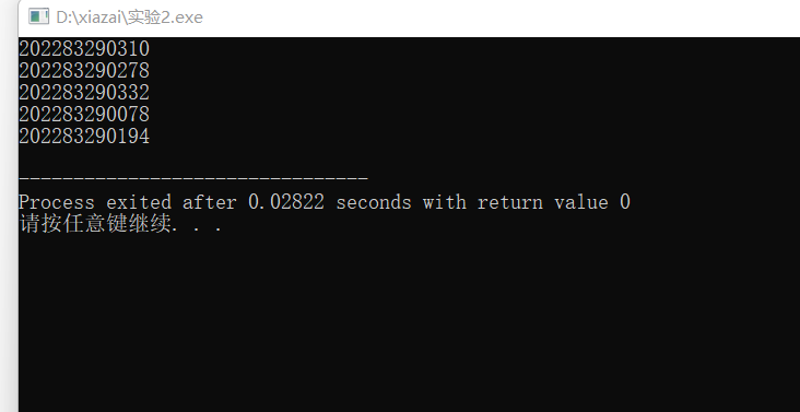 #include <stdio.h> #include <stdlib.h> #include <time.h> #define N 5 int main() { int number; int i; srand( time(0) ); // 以当前系统时间作为随机种子 for(i = 0; i < N; ++i) { number = rand()%500 + 1; printf("20228329%04d\n", number); } return 0; }