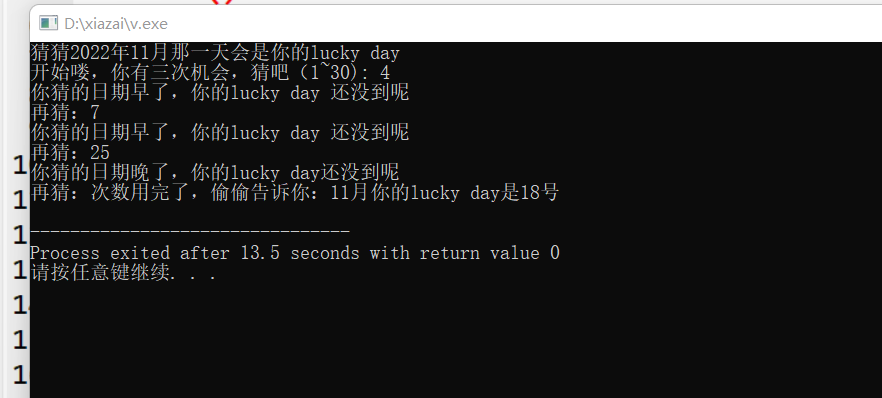 #include<stdio.h> #include<stdlib.h> #include<time.h> int main() { int num, lnum, i; printf("猜猜2022年11月那一天会是你的lucky day\n"); printf("开始喽,你有三次机会,猜吧(1~30): "); srand(time(0)); for (i = 1; i <= 3; i++) { scanf_s("%d", &num); lnum = rand() % 30 + 1; if (num == lnum) { printf("哇,猜对了\n"); break; } else if (num < lnum) { printf("你猜的日期早了,你的lucky day 还没到呢\n"); printf("再猜:"); } else { printf("你猜的日期晚了,你的lucky day还没到呢\n"); printf("再猜:"); } } if (i == 4) printf("次数用完了,偷偷告诉你:11月你的lucky day是%d号\n", lnum); return 0; }