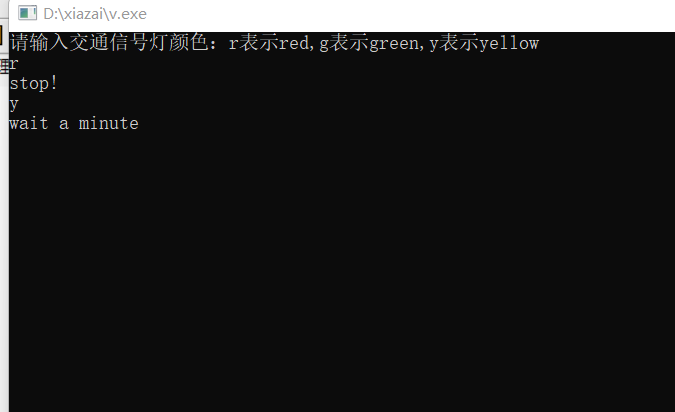#include<stdio.h> int main() { char color; printf("请输入交通信号灯颜色:r表示red,g表示green,y表示yellow\n"); while (scanf_s("%c", &color) != EOF) { getchar(); switch (color) { case 'r':printf("stop!\n"); break; case 'g':printf("go go go\n"); break; case 'y':printf("wait a minute\n"); break; default:printf("something must be wrong.....\n"); break; } } return 0; }