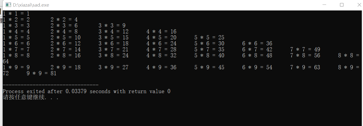 #include<stdio.h> int main() { int i, j; for (i = 1; i <= 9; i++) { for (j = 1; j <= i; j++) printf("%d * %d = %d\t", j, i, j * i); printf("\n"); } return 0; }